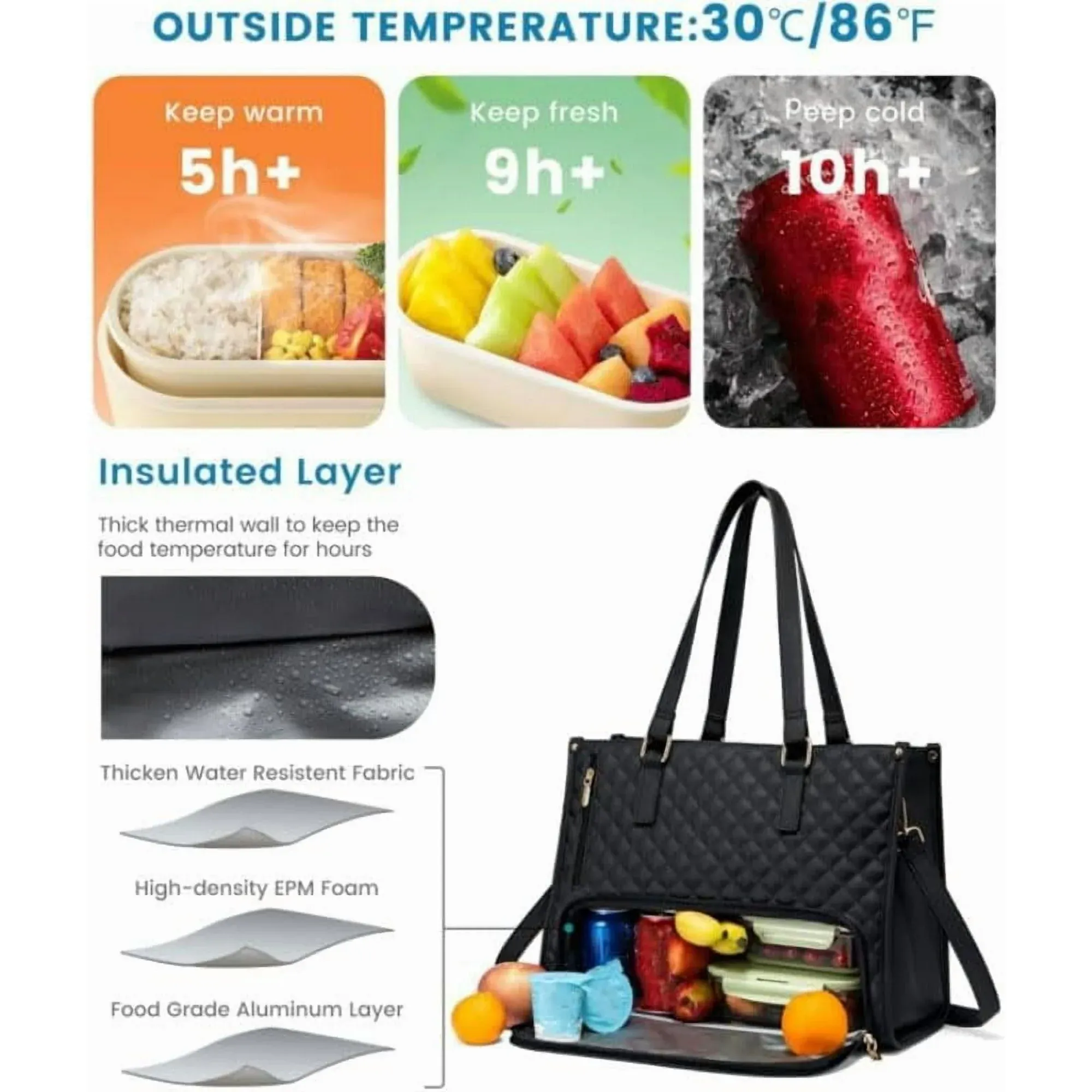 - Keeps meals warm for up to 5 hours and drinks chilled for 10+ hours (with ice packs).