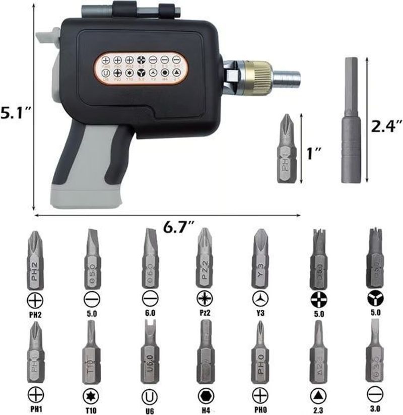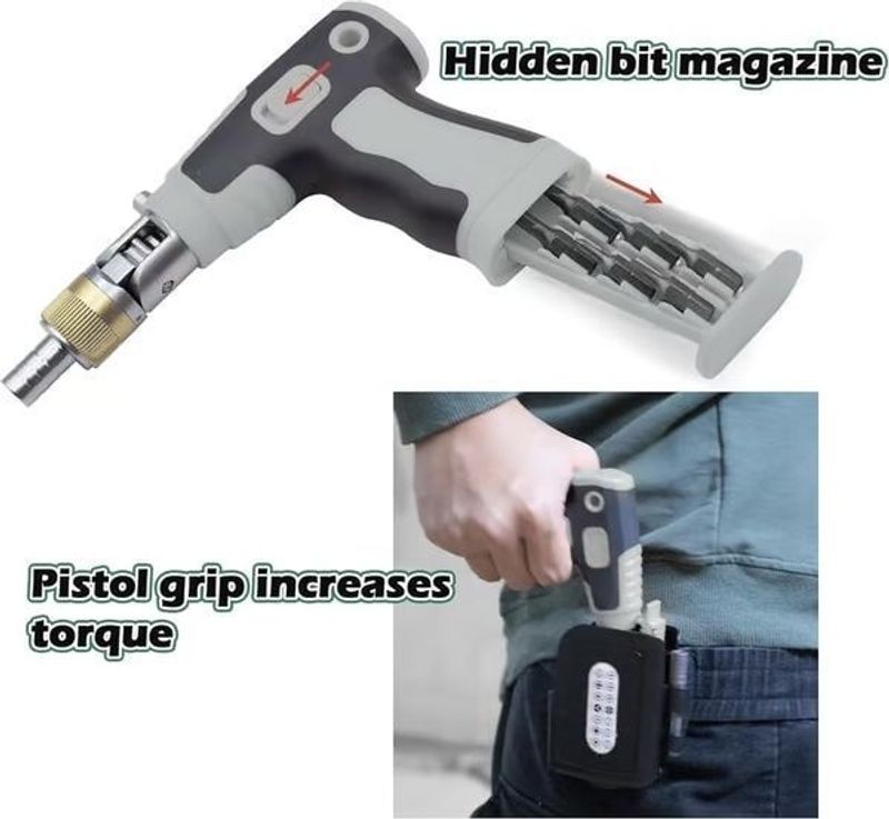 The screwdriver boasts an ergonomic pistol grip for comfort and ease of use, a pop-out magazine for quick bit changes, and a hidden bit storage for organizing all 14 bits.