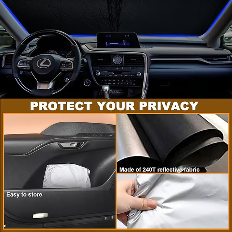 High-quality double-layer sunshade with superb heat absorption effect, reflecting UV rays on the front, absorbing heat and keeping warm on the back, physically cooling 20-30℃. Make it the best choice for your car shade cooling