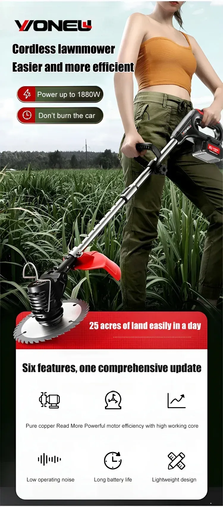 3. Cordless and mobile: No wires or restrictions - mow your yard, farm or garden anytime, anywhere.