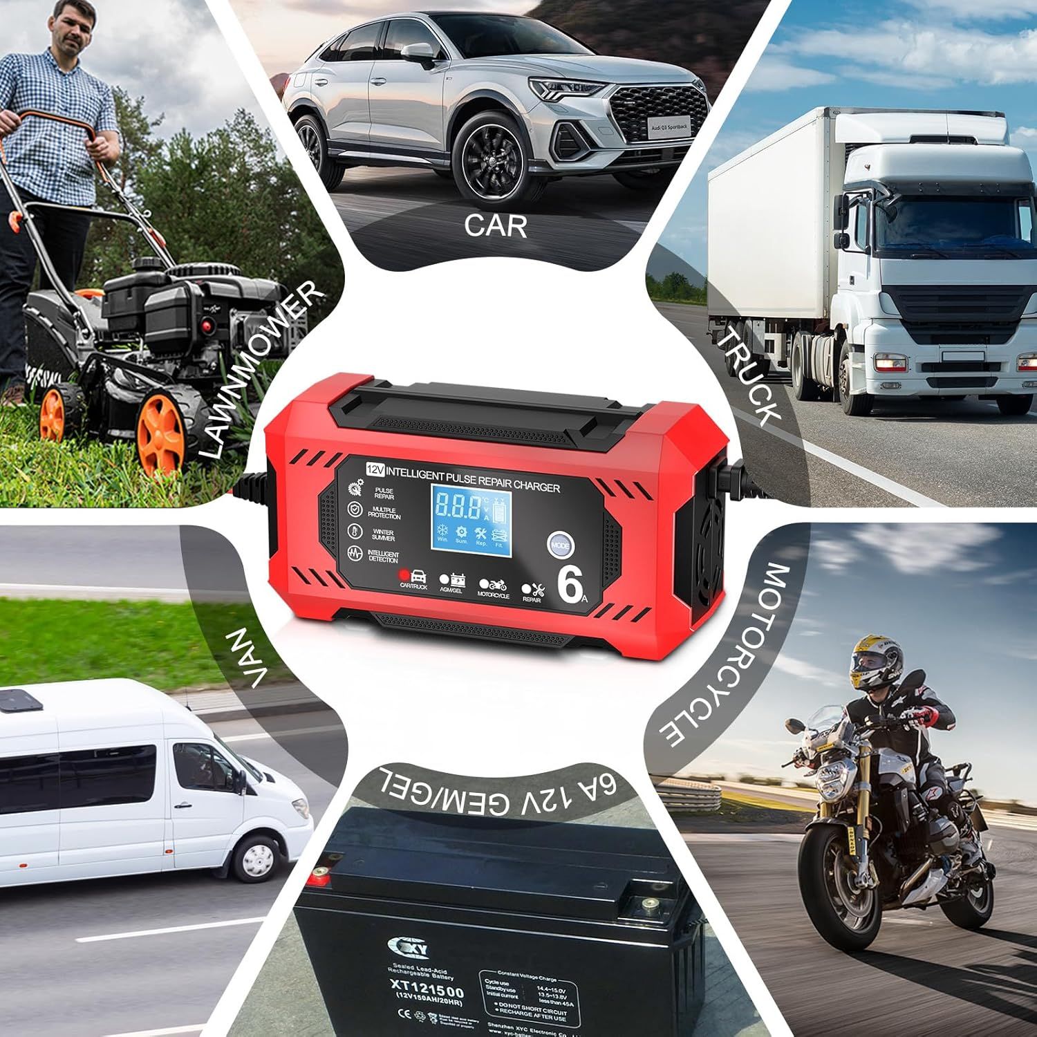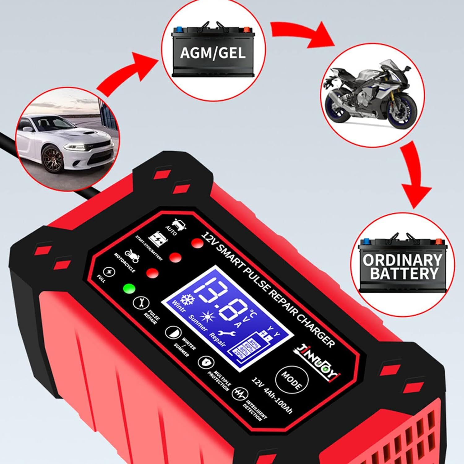MULTIPLE BATTERY COMPATIBILITY: Designed to support a wide range of 12V batteries from 4Ah to 100Ah, this charger is compatible with both lead-acid and lithium-ion batteries. It offers dedicated charging modes for cars, motorcycles, and other vehicles, ensuring universal application on different battery types.